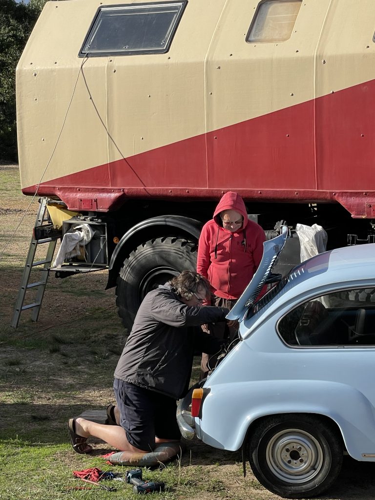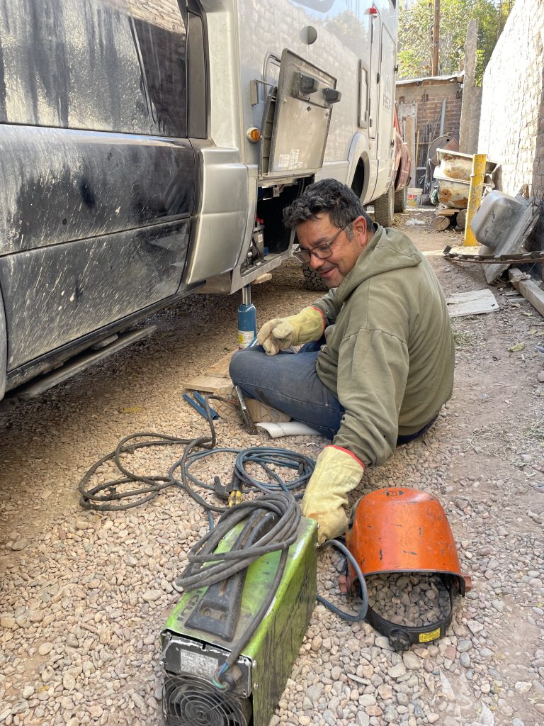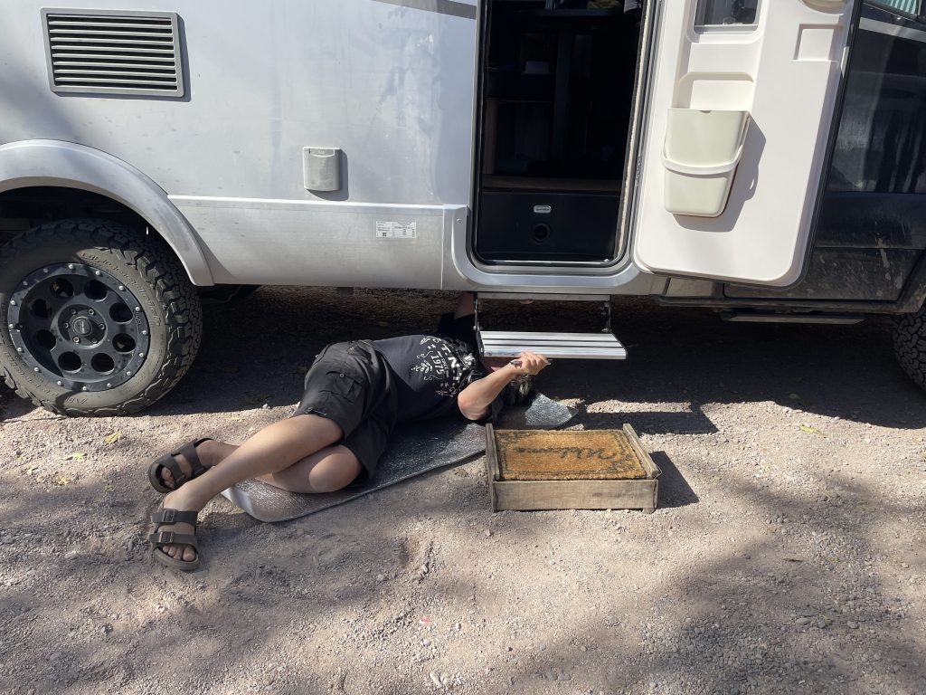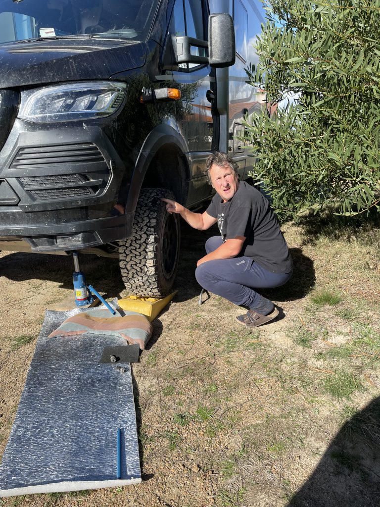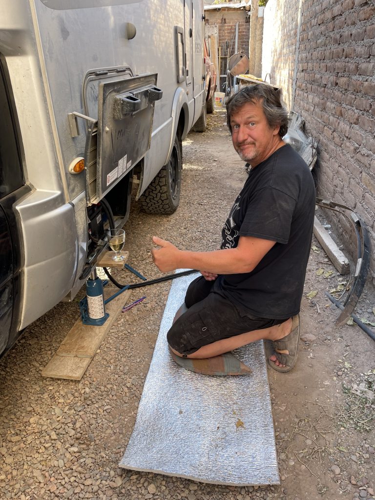 Andreas hat die nicht verplanten Tage natürlich dazu genutzt in unserem Wohnmobil die Schrauben wieder anzuziehen, die sich durch die holprigen Straßen immer wieder lösen. Selbst Ventilschrauben vom Fahrrad findet er neben dem Reifen wieder😳!! Natürlich sind auch aufwändigere Reparaturen nötig: die Versorgungsbatterien stehen in einem Außenfach in einer Plastikwanne und die ist durch den permanenten Steinschlag eingerissen …., also Metall nach Maß geordert und stabil befestigt = mit Besorgung der Schrauben usw. hat das ganze 2 Tage gedauert😇!