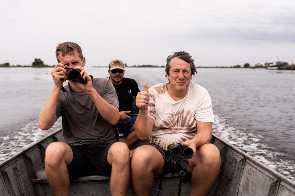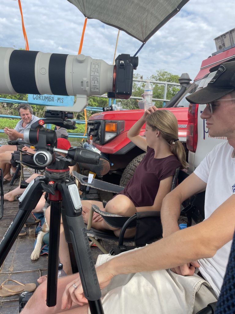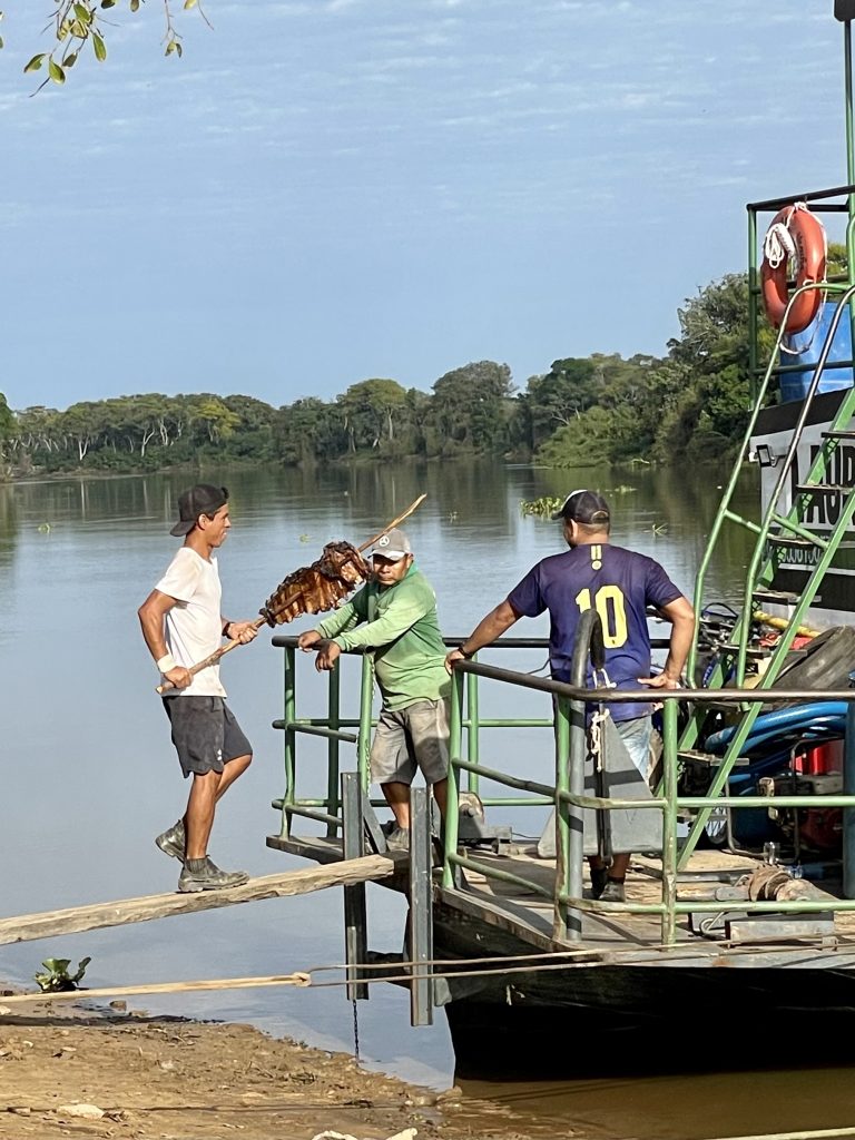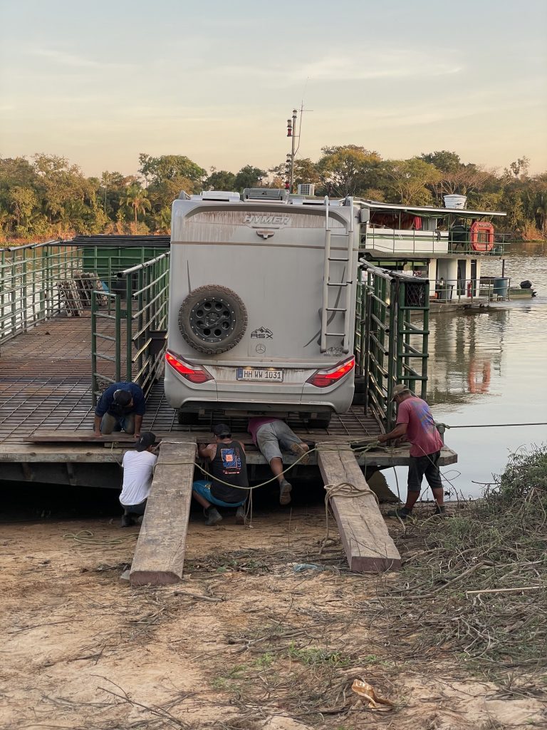 Am Montag, den 10. Juli kamen wir gegen 17 Uhr in Porto Jofre an und verabredeten uns gleich dafür, eine „Jaguar-Tour“ zu buchen. Da fahren wir auf einem kleineren Boot durch kleinere Flüsse und die Guides versprechen alle den Jaguar. Ihr merkt, wir waren angefixt und wollten „ihn“ nun endlich live sehen! Schon am übernächsten Tag war es soweit. Aber erst einmal stand die ebenfalls aufregende Entladung der Fahrzeuge an. Wie beim Start werden 2 Bretter an das Floß gelegt und schon ist alles für die Abfahrt vorbereitet!