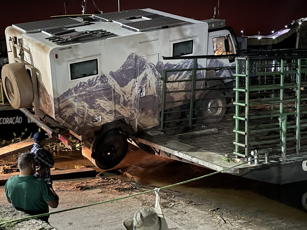 Am nächsten Tag ging es etwas holprig los! Das Fahrzeug von einem weiteren Pärchen, Rachel und Stewart, ein 7,5t LKW, rutschte bei der Auffahrt zum Floß vom Brett und krachte runter! Aufregung und gespannte Erwartung machte sich breit. 3-4 Stunden später kam ein Kran und richtete das Fahrzeug wieder auf und so konnte der LKW von Stewart konnte das Floß sicher erreichen – Beifall brandete auf! Das hat wirklich gut geklappt – trotzdem wurde schon zuvor besprochen, dass wir an einer anderen etwas flacheren Auffahrt auf die Flöße fahren.