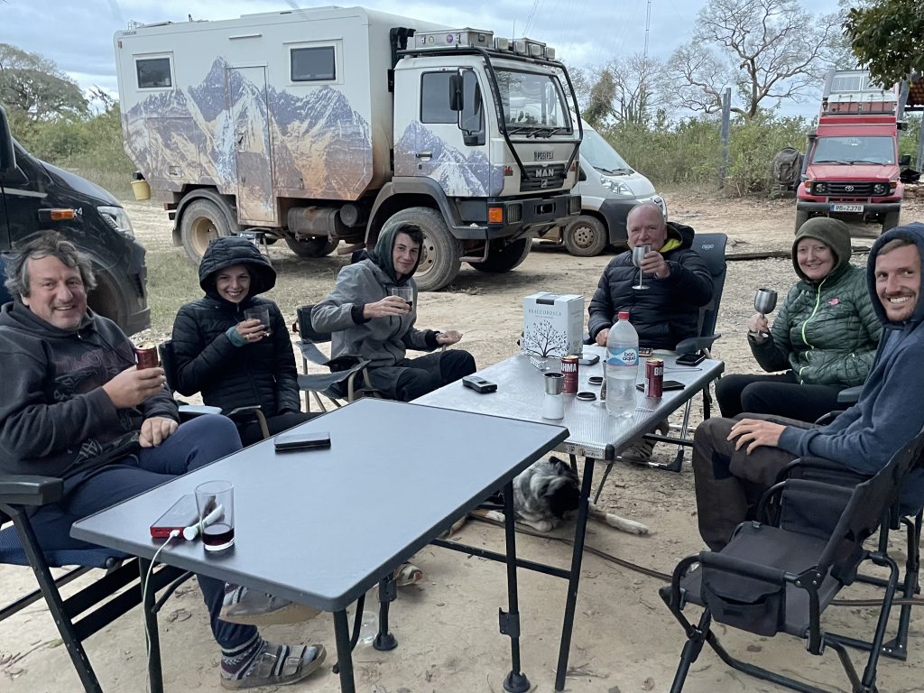 Geschlafen haben alle in ihren Fahrzeugen und mit Essen versorgt wurden wir aus der Kombüse. Mittags und Abends gab es Reis mit Nudeln, Kartoffeln und Bohnen, kleine Fleischstücke vom Rind oder Huhn dabei und selten mit einem kleinen Kleks Salat – und es schmeckte uns nicht so schlecht😊. Sogar mit frisch gegrilltem wurden wir versorgt😋.