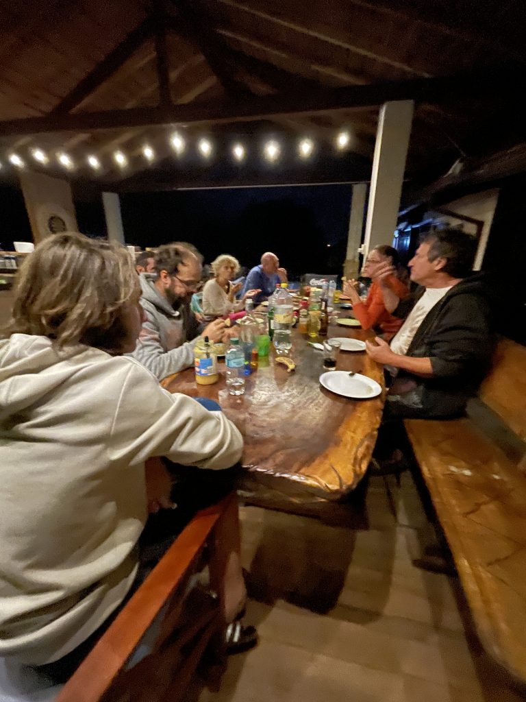 Mit dem Platz hatten wir mal wieder großes Glück. Es gab eine große Outdoor-Küche für alle, in der der eine oder andere fröhliche Abend stattfand. Auf dem Foto gab es Crepes mit Belag nach Wunsch. Auf Empfehlung der Köch:innen probierten wir die Crepes mit Zitronensaft, Zucker und wenige Tropfen Rum – total lecker! Dank der Besitzer:innen Astrid und Christian hatten wir hier eine schöne Zeit!